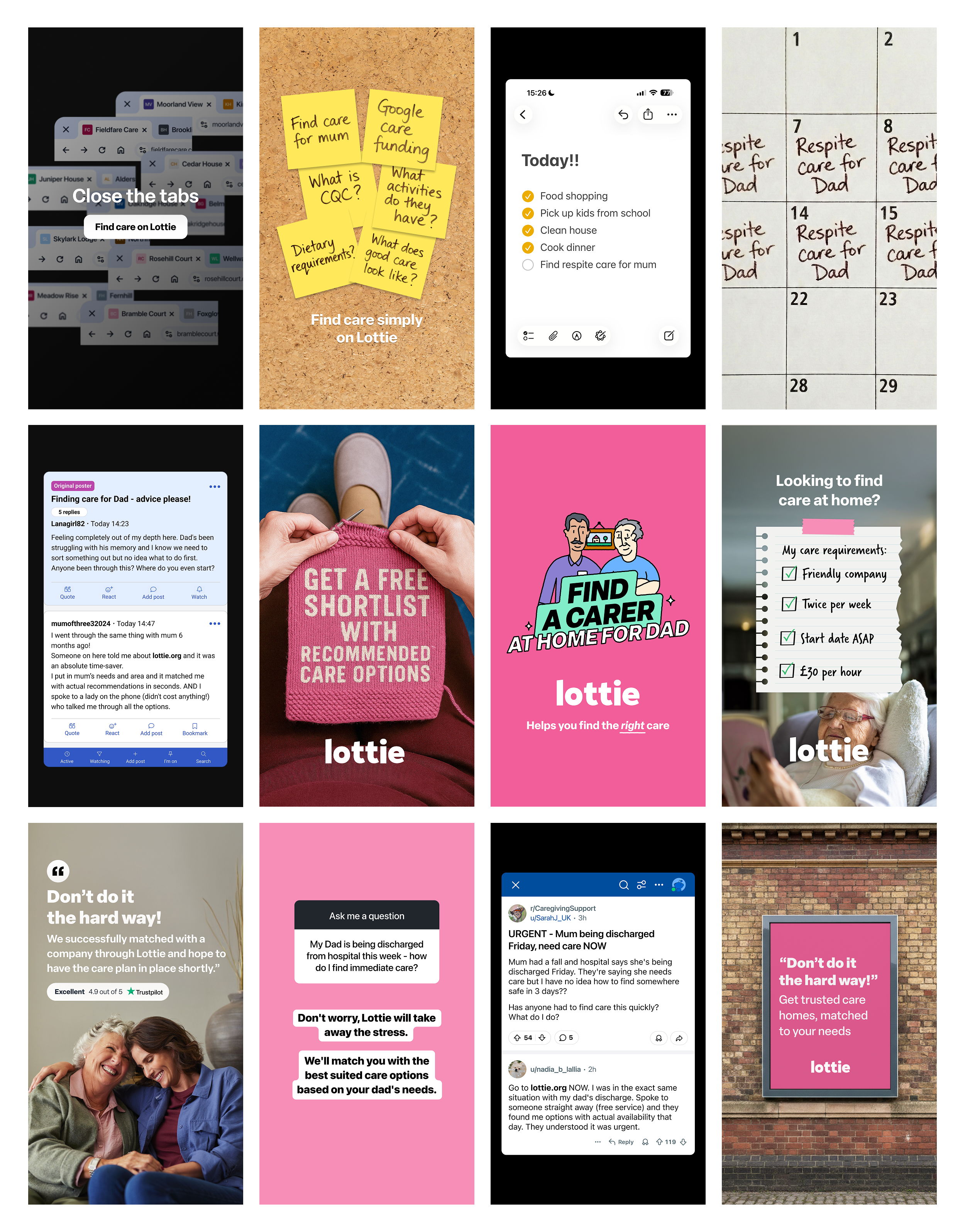 215% YoY revenue growth on Meta. The shift? Less iteration, more innovation. Each month, I work closely with Marketing to launch entirely new creative concepts - not small optimisations, but fundamentally different ideas. AI helps us move faster from idea to execution, allowing us to test more and learn quicker. Bold, direct ads that cement Lottie as the UK’s number one care marketplace.